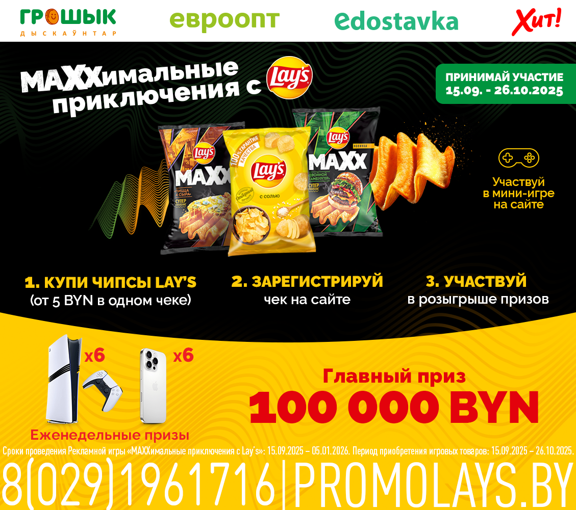 с 15 сентября по 26 октября 2025 года покупай любые чипсы Lay’s от 5 BYN в чеке в магазинах «Евроопт», «Хит!», «Грошык», интернет-магазине edostavka.by и регистрируй чек на сайте PROMOLAYS.BY.